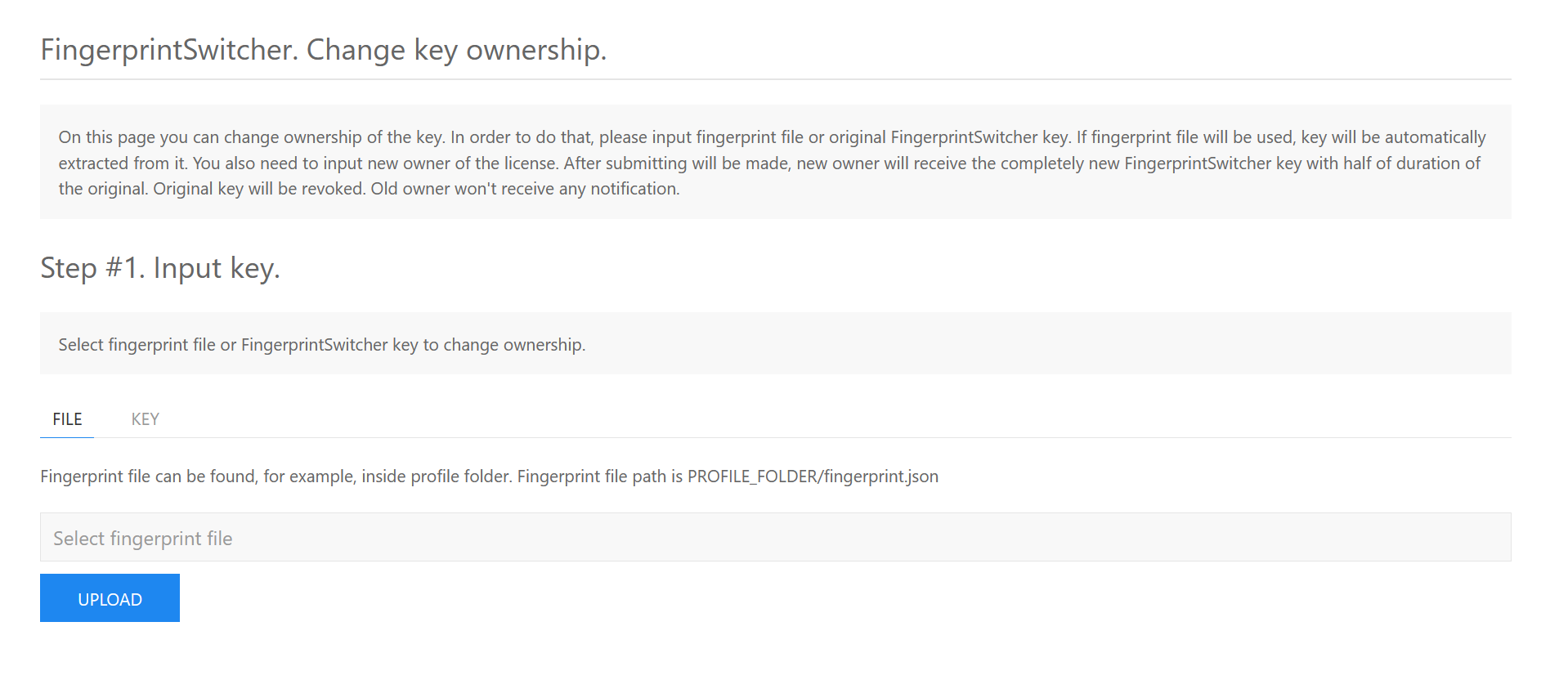 It allows you to get the key to the service from the fingerprint file. The user who uploaded the fingerprint will receive a new key, and the old one will be revoked. Screen.