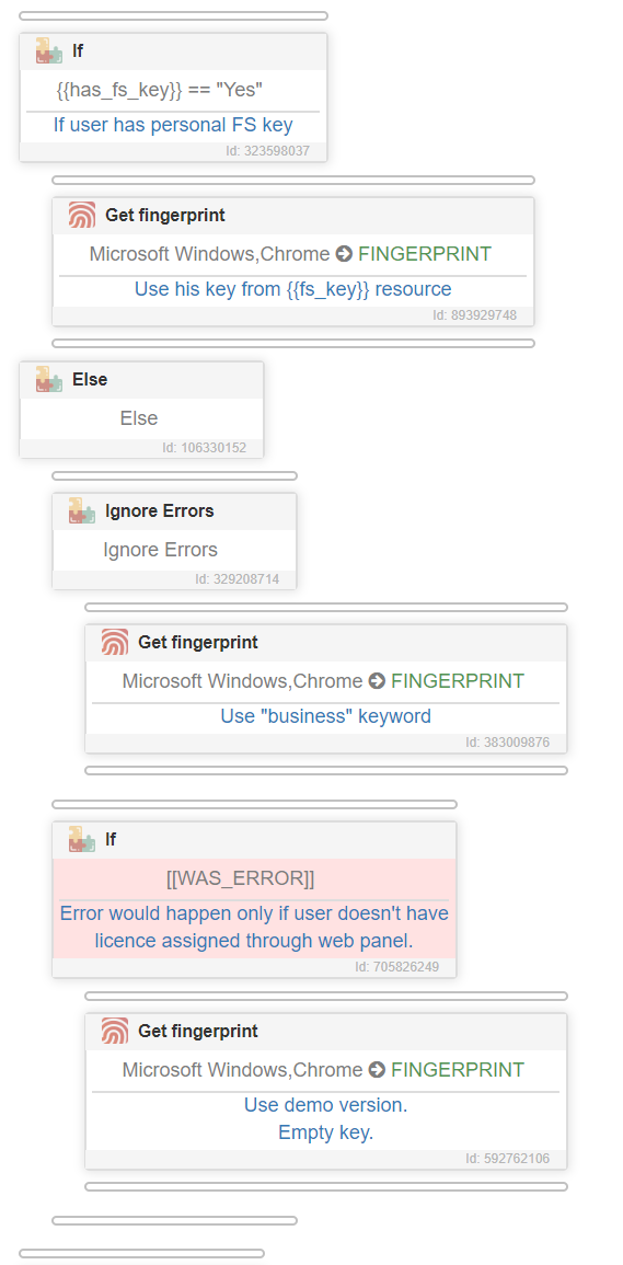 If key through FingerprintBusiness license is not available, this action will throw exception. At this point we can leave this as is, or we can use “Ignore Errors” action.