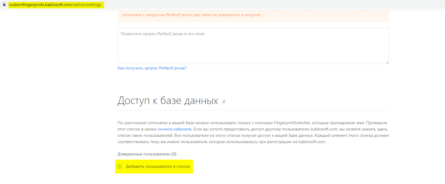 Вы также можете предоставить доступ любому другому пользователю bablosoft на следующей странице. (ссылка, скрин). После задания имени пользователя все ключи FingerprintSwitcher этого пользователя будут иметь доступ к вашей базе данных. Это особенно полезно, если вы являетесь владельцем скрипта и хотите предоставить доступ к базе всем пользователям вашего скрипта.