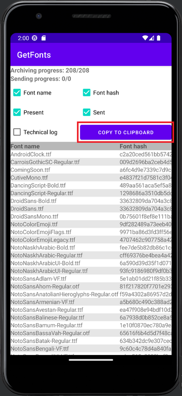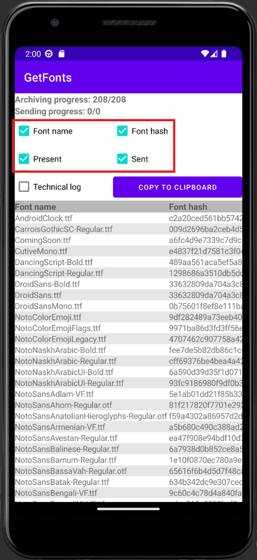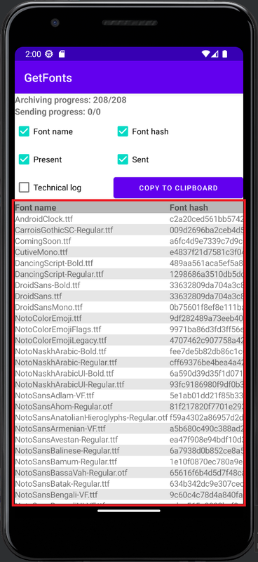Приложение GetFonts разработано для сбора данных шрифтов со смартфона. Приложение не требует каких либо дополнительных разрешений от пользователя и может быть установлено на любой смартфон с операционной системой Android с минимальной версией 4.1.1 После запуска приложения вся работа будет происходить в автоматическом режиме. Кнопки управления влияют только на отображения данных работы на экране.