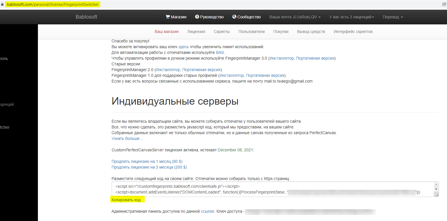 Вы также можете предоставить доступ любому другому пользователю bablosoft на следующей странице. (ссылка, скрин). После задания имени пользователя все ключи FingerprintSwitcher этого пользователя будут иметь доступ к вашей базе данных. Это особенно полезно, если вы являетесь владельцем скрипта и хотите предоставить доступ к базе всем пользователям вашего скрипта.