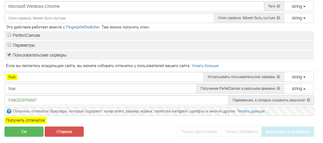 - Наконец, вы можете использовать отпечатки из своей базы в BrowserAutomationStudio, установив для параметра «Использовать пользовательские серверы» значение true в действии «Получить отпечаток». Вы также можете установить параметр с таким же названием в FingerprintManager. (скрин)