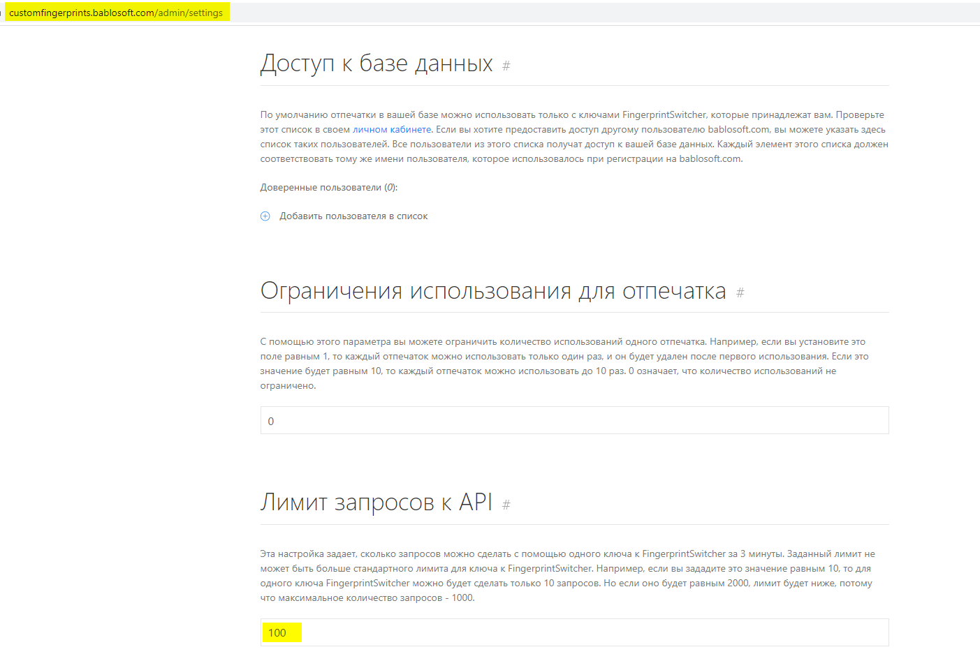Количество запросов в минуту к CustomServer такое же, как и для стандартной базы данных сервиса FingerprintSwitcher. Вы также можете сделать этот предел ниже для своей базы данных(но не выше) с помощью следующих настроек. (ссылка, скрин)